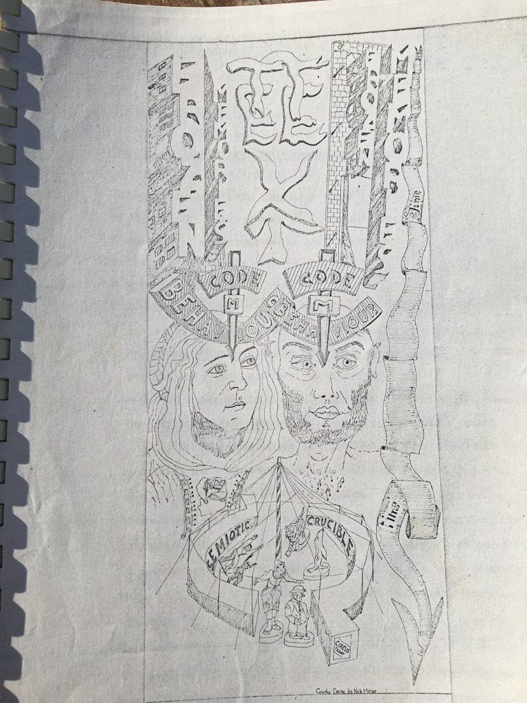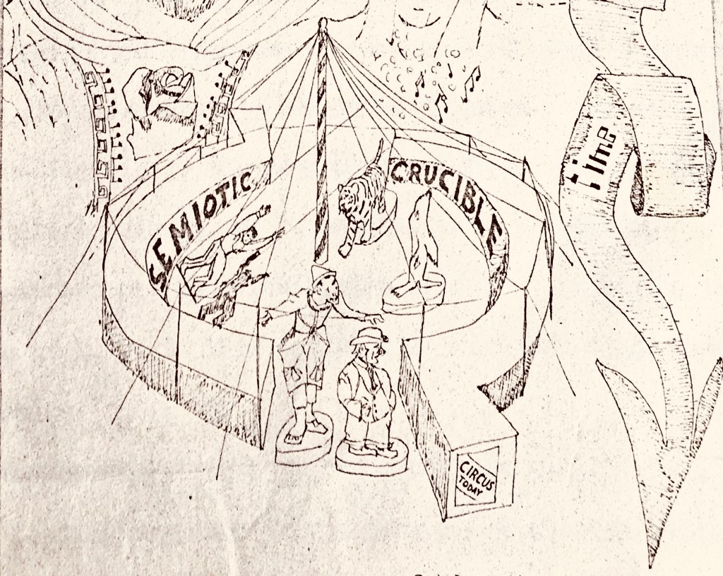 From the perspectives of both then and now, the world appeared to be entering a firestorm of cultural and political upheaval, fired by resource over exploitation and population growth. Already in 1977 the graphs were going exponential, and clearly a crisis was looming. When I finished the review, I found myself carrying on to address the global problem. Our story, the human story, was and is headed for calamity. This has become immediate now with the Corona virus outbreak, global warming, the reality of one third of the world population on the poverty line (this before Covid 19), and continuing exponential graphs for all kind of global parameters, extinctions, migrations, rising sea level, and now global pandemic. The summary statement of my review of Paul Bouissac’s book was done as art work – a cartoon- by my cousin Nick Meyer. It shows the text of everyday life represented by a male and female figure, interlinked, leaving a story behind them among frozen memories, made up of the architecture and technology they live with. But they were going to a circus, a semiotic crucible, where their cultural categories might have an opportunity to be displayed, examined, and re defined. When the text resumes, after the circus, it may be quite different as a result of the experience.